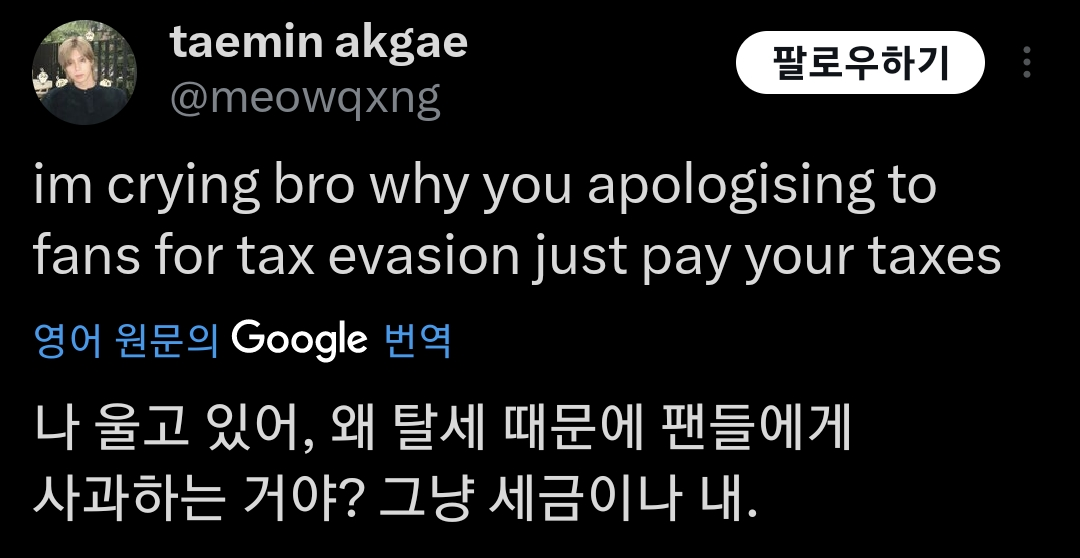 믿었던 얼굴천재 탈세에 현타 온 k-pop팬들 댓글 0 조회 579 2026-01-27 20:31 공룡 Lv.5 게시글 보기 총 게시글: 1,532개 총 댓글: 0개 공룡님의 다른 글 26.01.27 미국 치안 체감짤 26.01.27 드라마 <더 글로리> 정성일의 명대사 26.01.27 차은우랑 비슷한 액수 탈세한 팝스타 최후 26.01.27 현재 일본 대중들 난리나게 만든 여돌 멤버