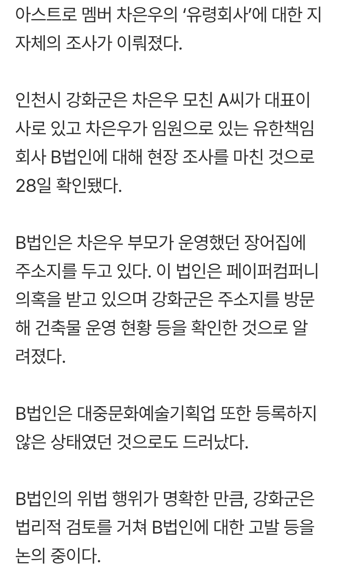 차은우 페이퍼컴퍼니 영업점 미등록으로 확인 댓글 0 조회 599 2026-01-28 11:50 가비슈포댄서 Lv.12 게시글 보기 총 게시글: 1,502개 총 댓글: 0개 “페이퍼컴퍼니·미등록 영업 위법 소지” 대중문화예술기획업 또한 등록하지 않은 상태였던 것으로도 드러났다. https://naver.me/FSSra7iT 파도파도 괴담만... 가비슈포댄서님의 다른 글 26.01.28 모두를 놀라게 만든 손오공의 행동 26.01.28 포브스 선정 2025년 가장 많이 번 뮤지션들 26.01.28 한국 여자와 결혼한 백인 아재 26.01.28 MBTI T와 F가 다르게 해석하는 말