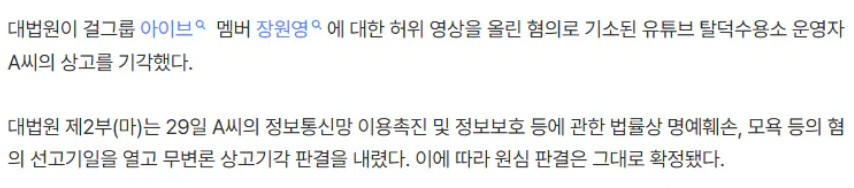 탈덕수용소 "장원영 가짜뉴스" 대법원 상고 기각 댓글 0 조회 543 2026-01-29 16:37 네이마르로 Lv.4 게시글 보기 총 게시글: 1,558개 총 댓글: 0개 https://m.entertain.naver.com/home/article/108/0003404038 네이마르로님의 다른 글 26.01.29 대기업 출신 상무 때문에 회사가 박살 26.01.29 일본 미모의 정치인 ㄷㄷ 26.01.29 키아누 리브스 신작영화 문구 26.01.29 약한 모습의 오타니를 그려줘