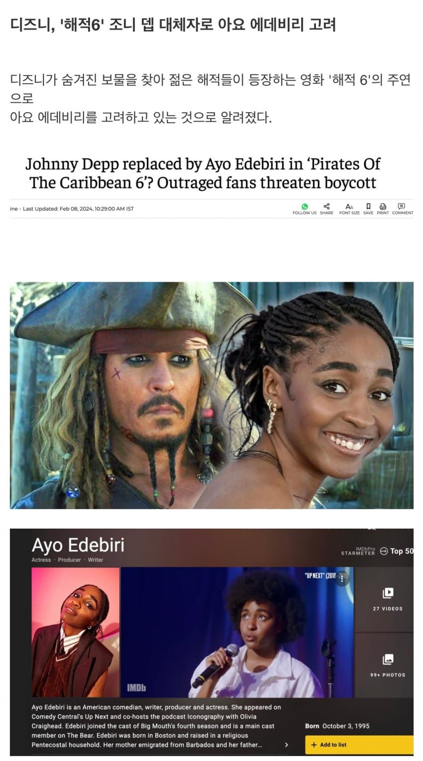 캐러비안해적 신작에 조니뎁 대신 아요 에데비리 고려중