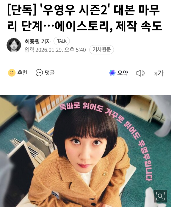 29일 관련 업계에 따르면 문 작가는 현재 이상한 변호사 우영우 시즌2 대본 작업을 진행하고 있다. 사안에 정통한 업계 관계자는 "우영우 시즌2 제작은 정상적으로 추진되고 있다"며 "작가가 대본 집필을 곧 마무리하는 단계"라고 말했다.