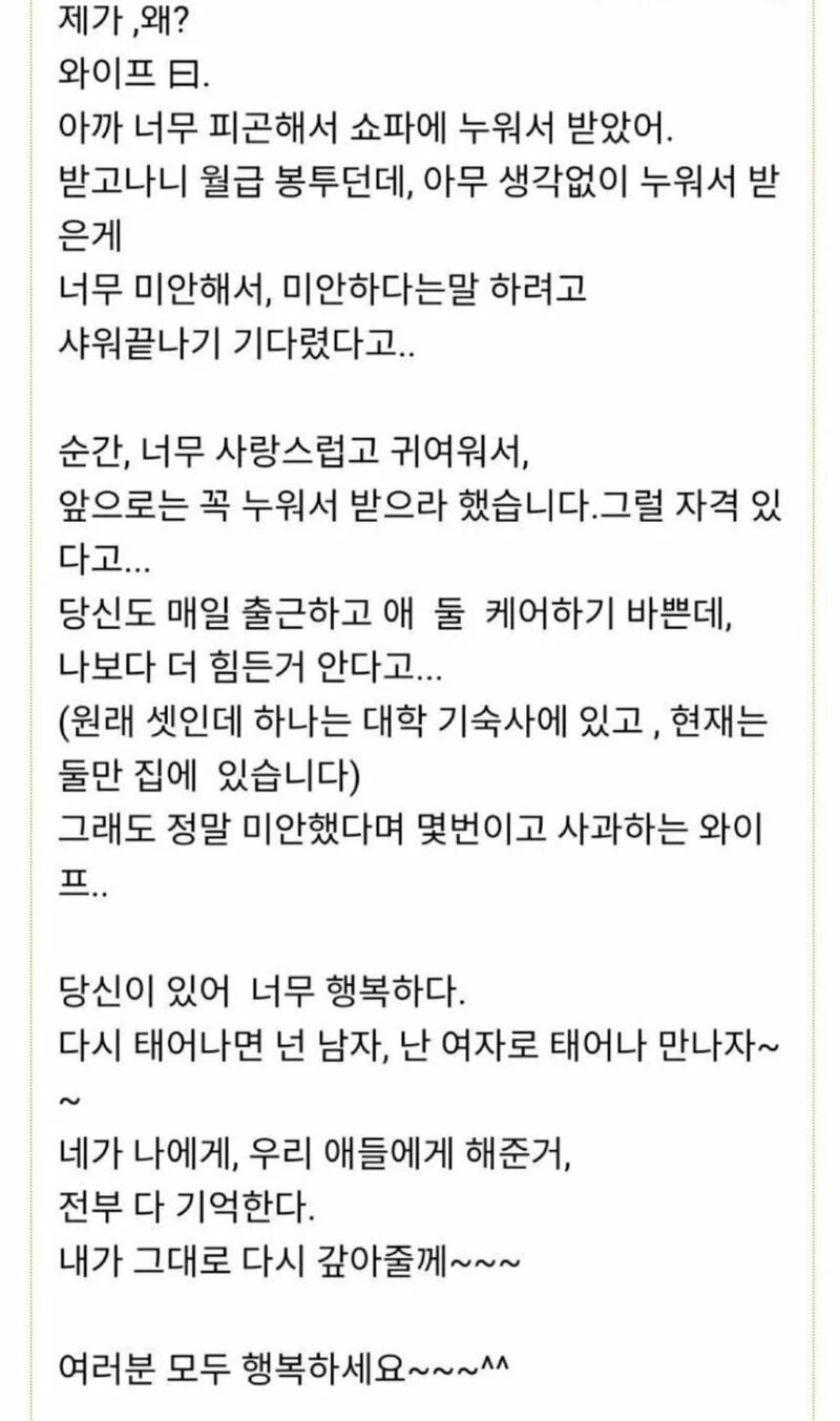남편 월급 누워서받은게 너무 미안하다는 아내