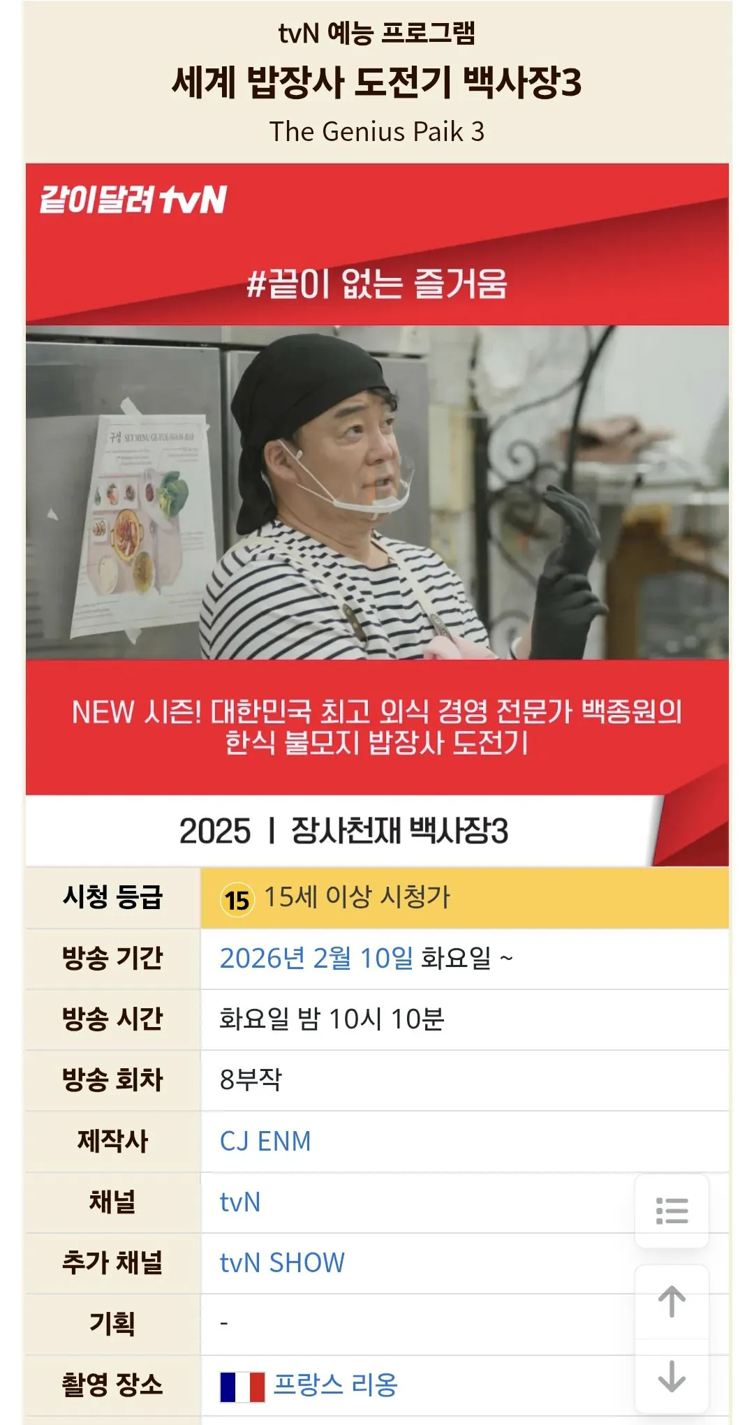 백종원 "세계 밥장사 도전기 백사장3" 2월 10일 첫 방송