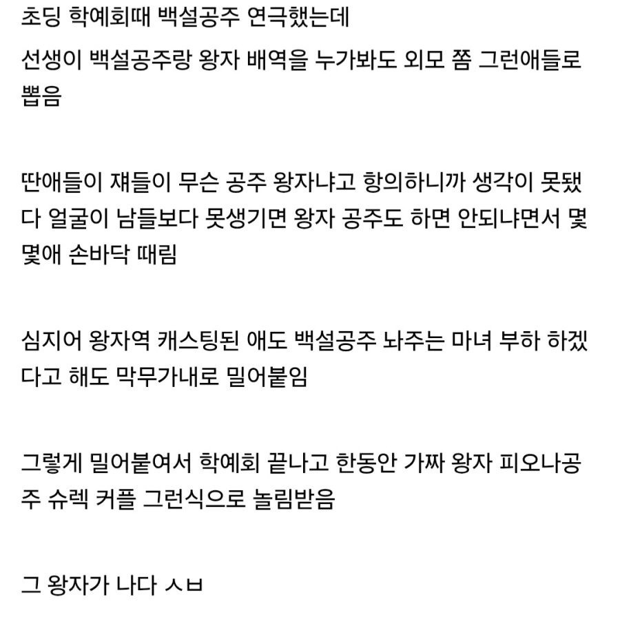초등학교 학예회때 미친 선생 때문에 왕자 역할 맡은 왕따
