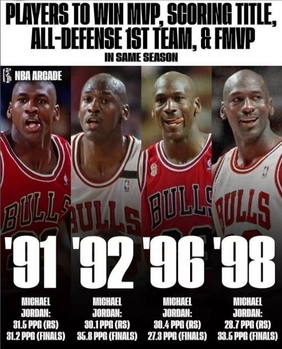 우승 / 파이널 MVP / 정규시즌 MVP / 득점왕 / 디펜시브 퍼스트팀한 시즌에 이 모든걸 이룸