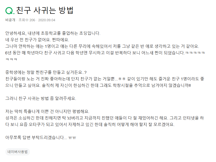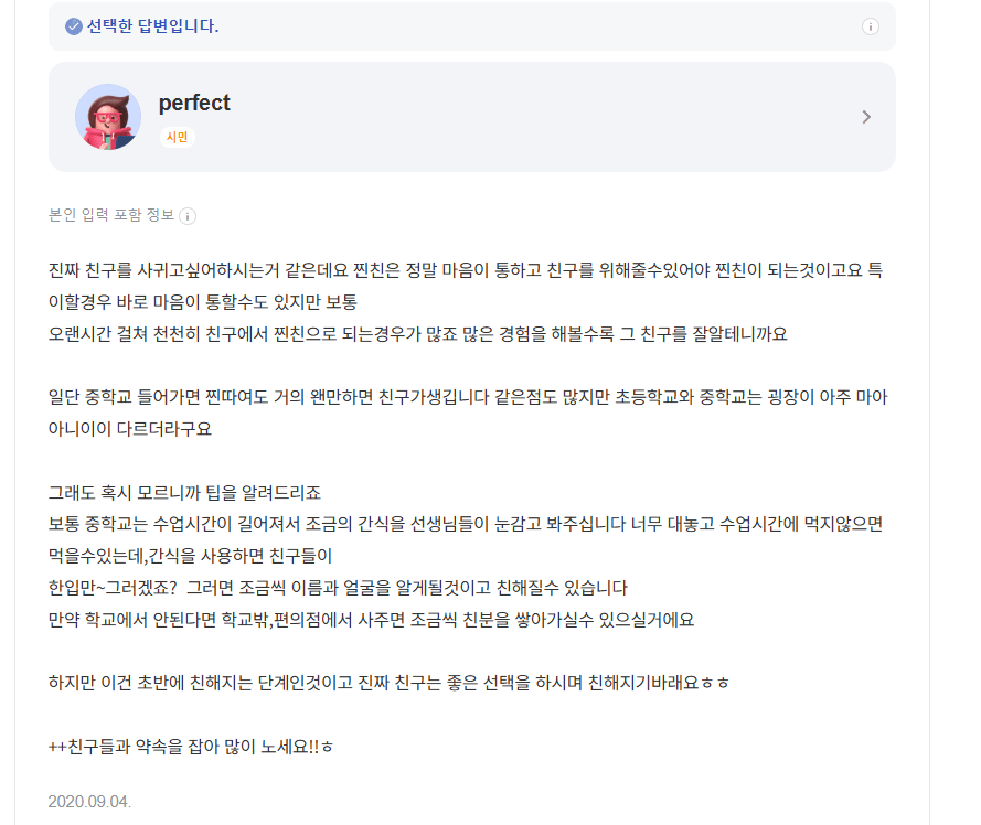 "중학교 들어가면 찐따여도 거의 왠만하면 친구가생깁니다"