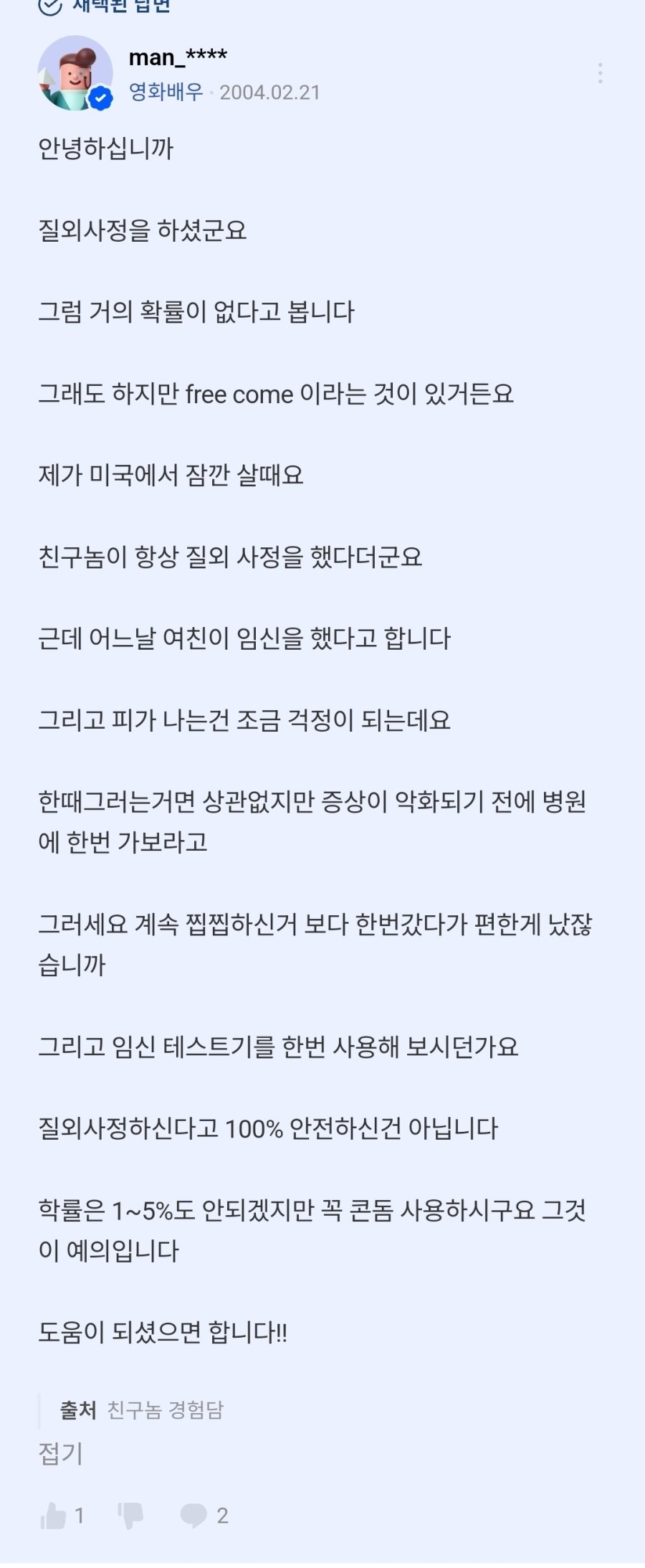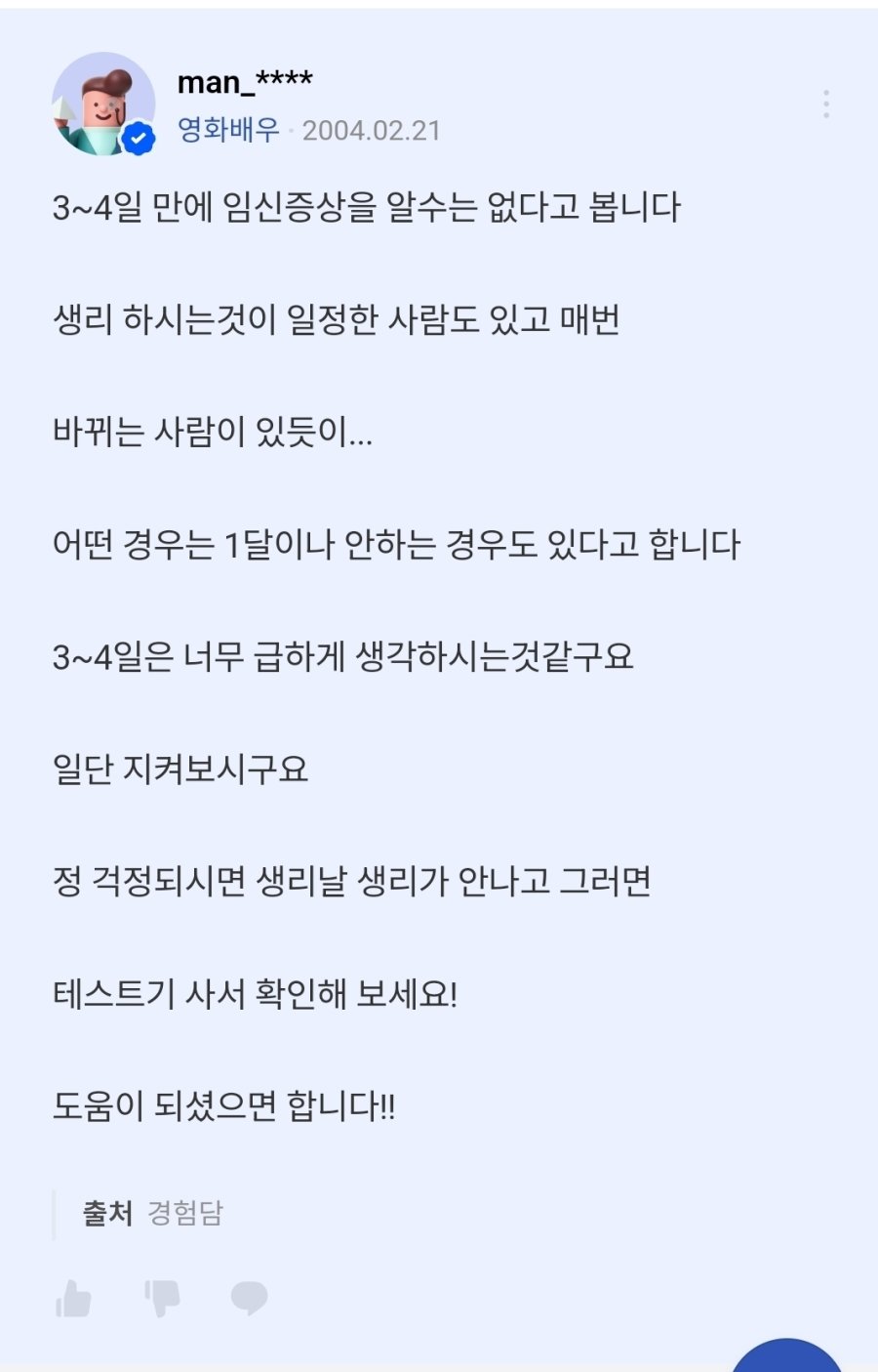 임신에 대한 경험이 많은 듯한 배우의 지식인 답변