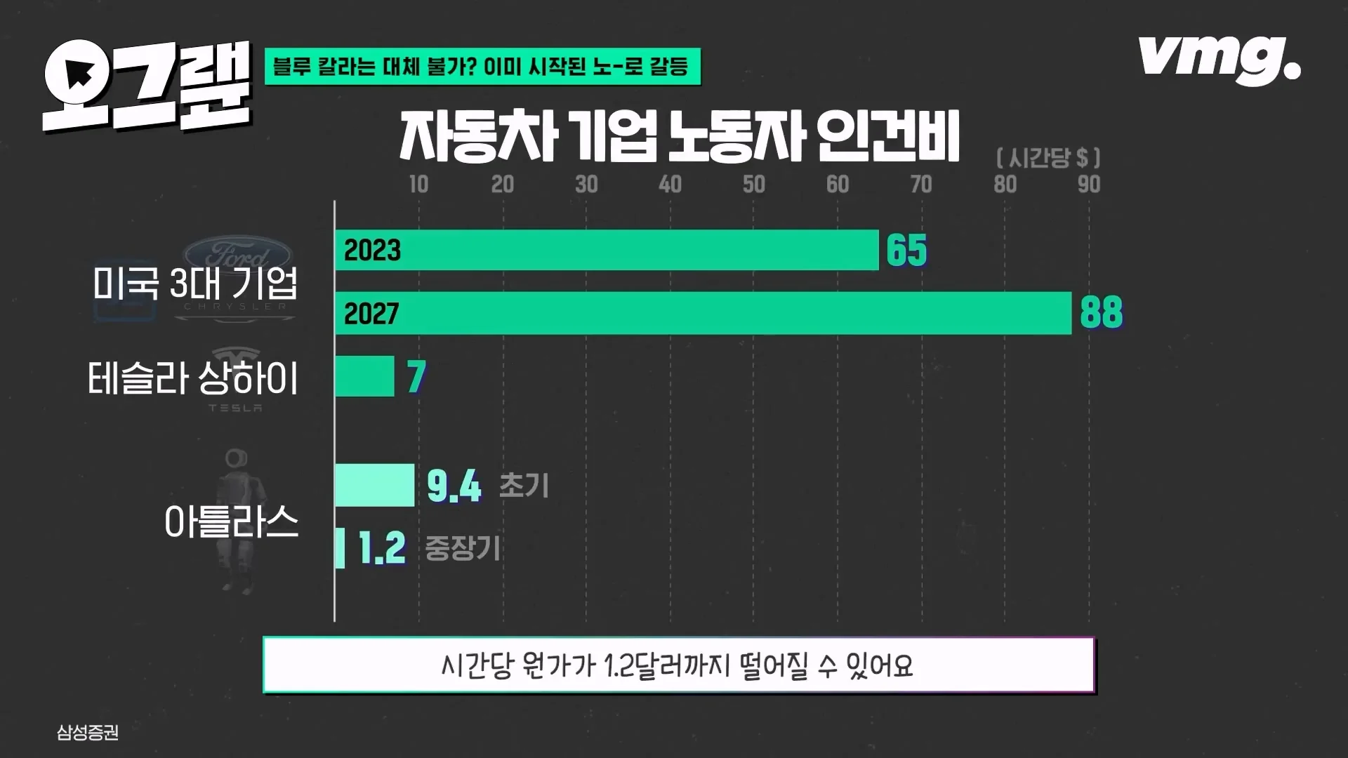 미국 자동차 3대기업 GM.포드,크라이슬러 23년 기준 시간당 65달러 27년이 되면 88달러가 될 에정