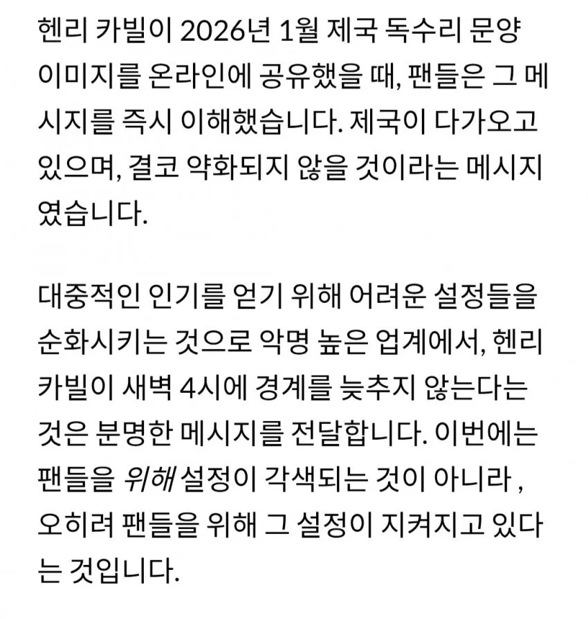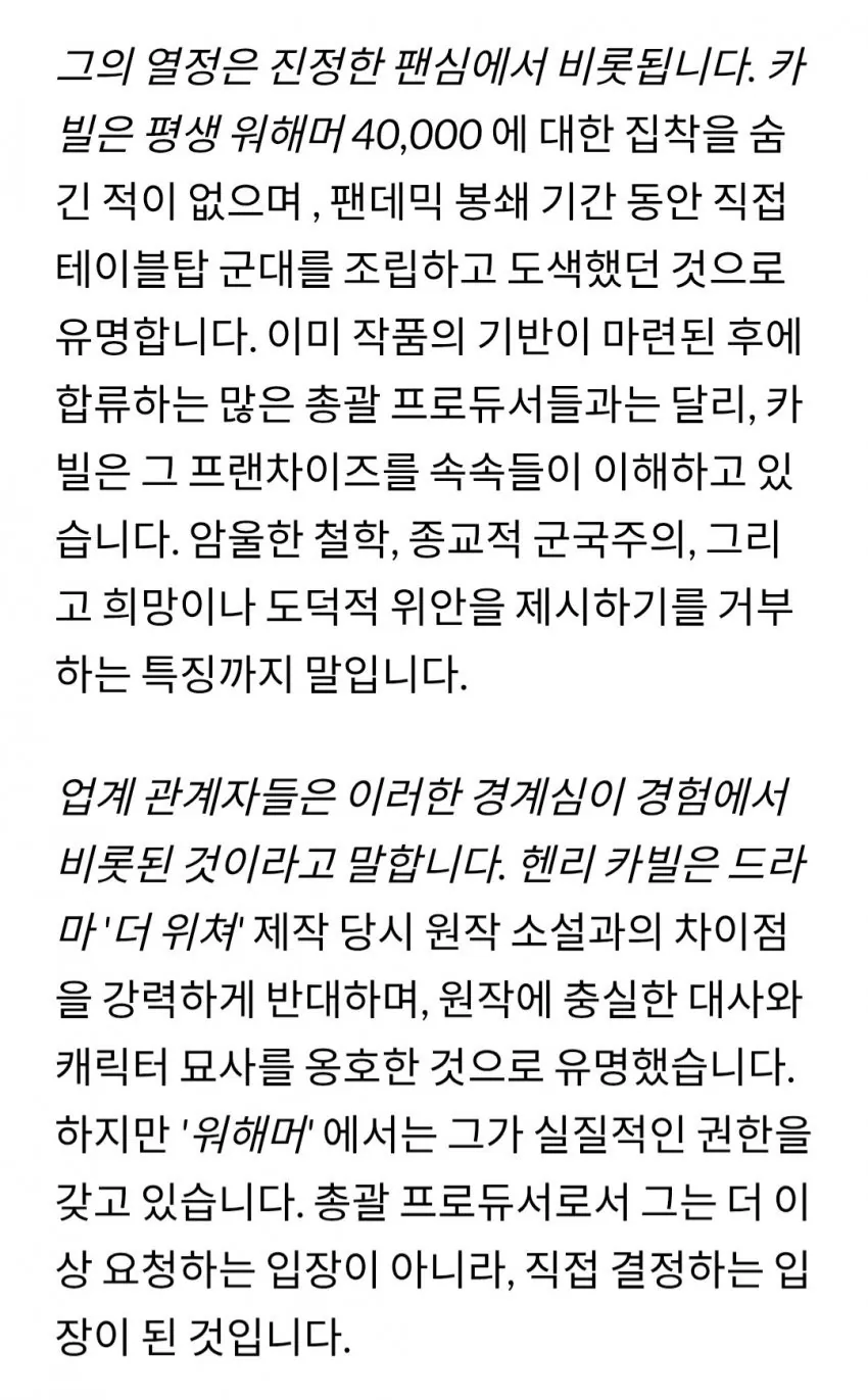 총괄 프로듀서인 헨리카빌이 대본을 새벽 4시까지