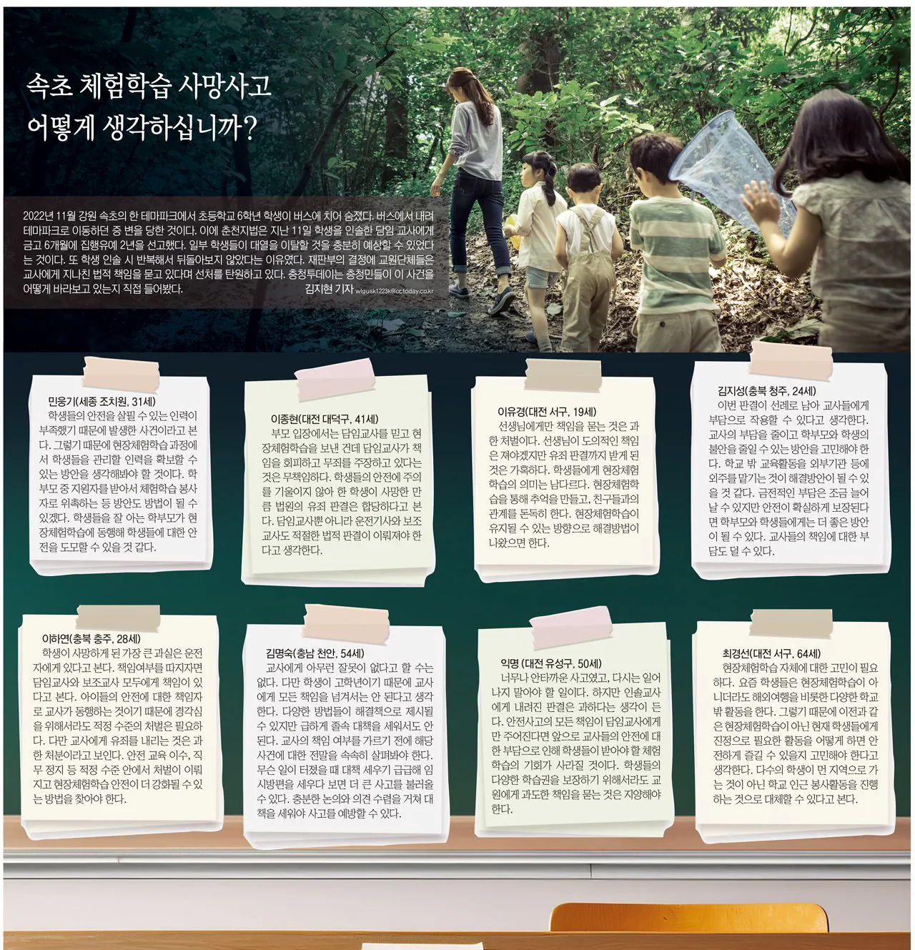 학생들의 체험학습 안전을 위해 보다 많은 관심이 필요한 이유다. 관심이 식으면 교사들은 소극적으로 변할 수 밖에 없고, 그 피해는 고스란히 학생들이 받을 것이다. 그래서 많은 관심과 논의가 있길 바란다.