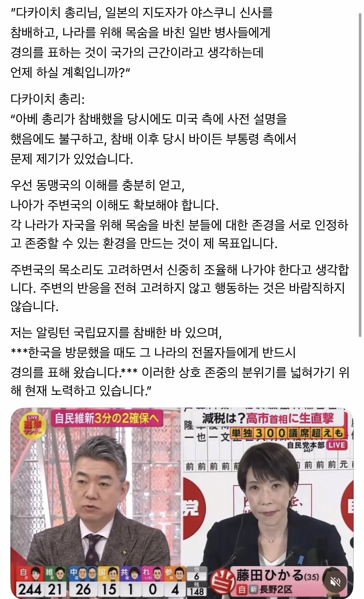 야스쿠니 참배관련 다카이치 답변