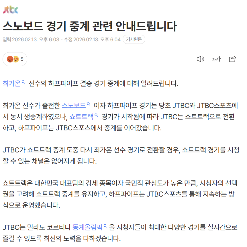 최가온 경기 미중계에대한 JTBC 공식입장 발표
