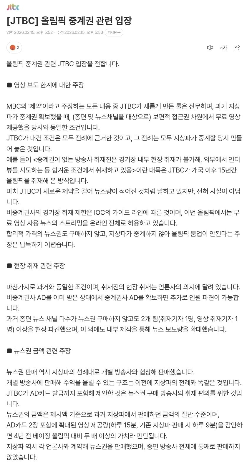 JTBC 올림픽중계권 논란 공식입장 발표