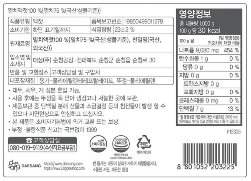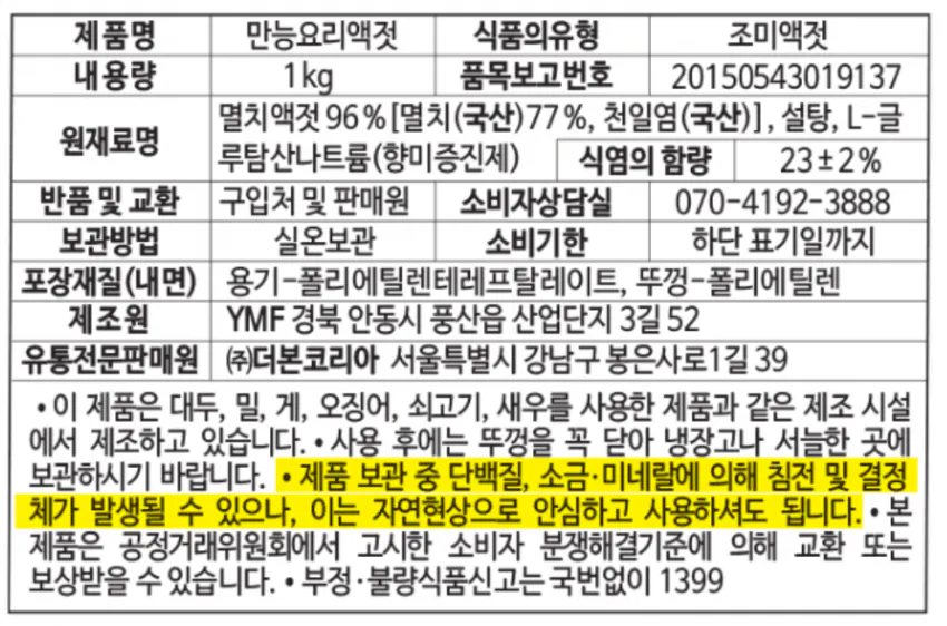 백쿡 액젓 = 멸치액젓 96% + 설탕,조미료