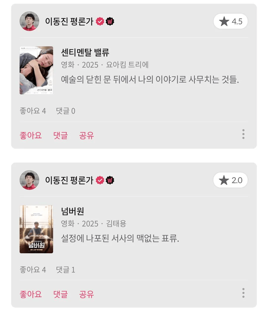 이동진 평론가 이번주 별점 (센티멘탈밸류 넘버원)