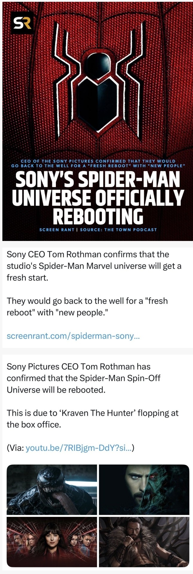 소닉픽처스 CEO 톰 로스먼은 최근 ‘크레이븐 헌터’ 흥행 부진으로 스파이더맨 스핀오프 유니버스를 리부팅 할 것이라 선언