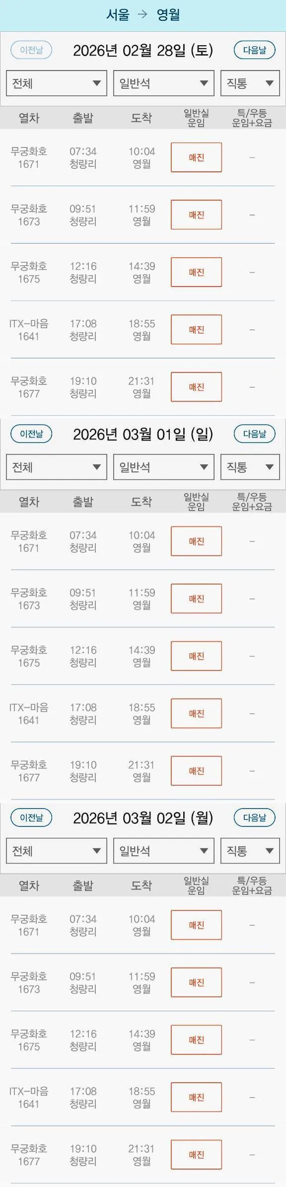 이번 연휴 서울에서 영월가는 기차 전부 매진