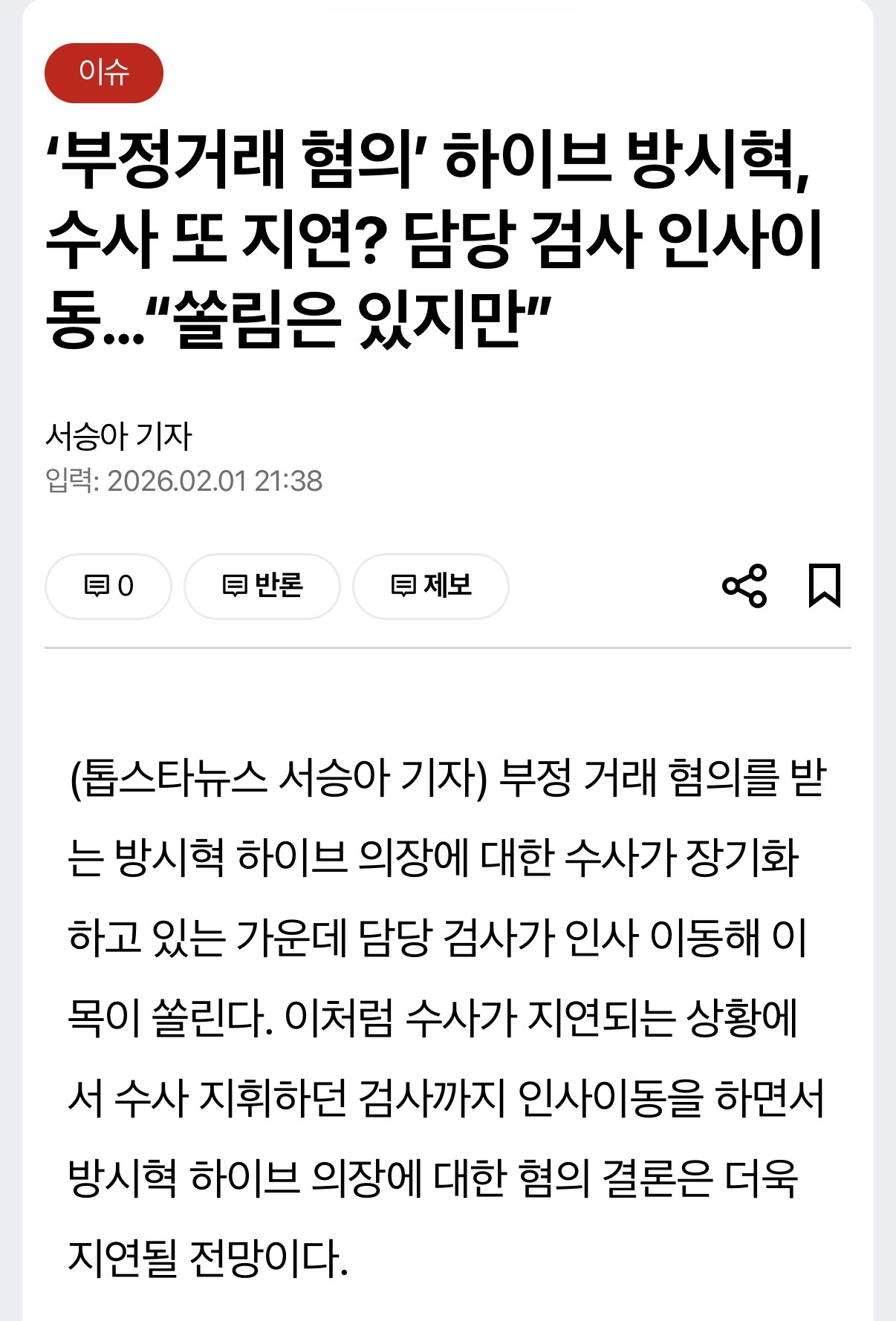 방시혁 사건 수사 담당 검사가 인사이동했고