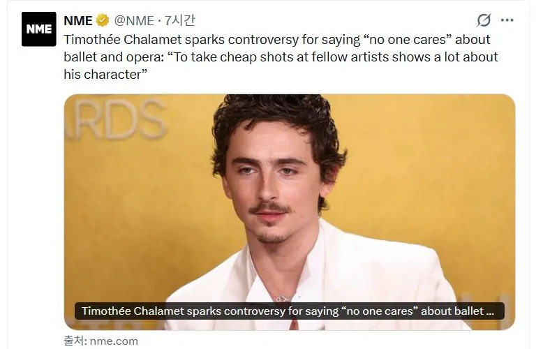 현재 욕 쳐먹고 있는 티모시 샬라메 망언 댓글 1 조회 583 2026-03-07 08:19 공룡 Lv.5 게시글 보기 총 게시글: 1,835개 총 댓글: 0개 "나는 사람들이 관심을 갖는 예술 분야에서 일하고 싶다. '아무도 관심 없지만 제발 이것 좀 살려달라'고 애걸복걸해야 하는 발레나 오페라 같은 곳에서 일하고 싶지 않다." 갑자기 발레랑 오페라 디스해서 동료 예술가들 깎아내린다고 욕쳐먹고 있음 오스카 유력 수상 후보였는데 투표는 이미 끝나서 이게 영향이 있을지는 모르겠고 공룡님의 다른 글 +2 26.03.07 경험치 +2 26.03.07 스벅 가입해서 2만원 +1 26.03.07 야구 픽 좋은거 있나요? +2 26.03.07 적중티비 가입했음