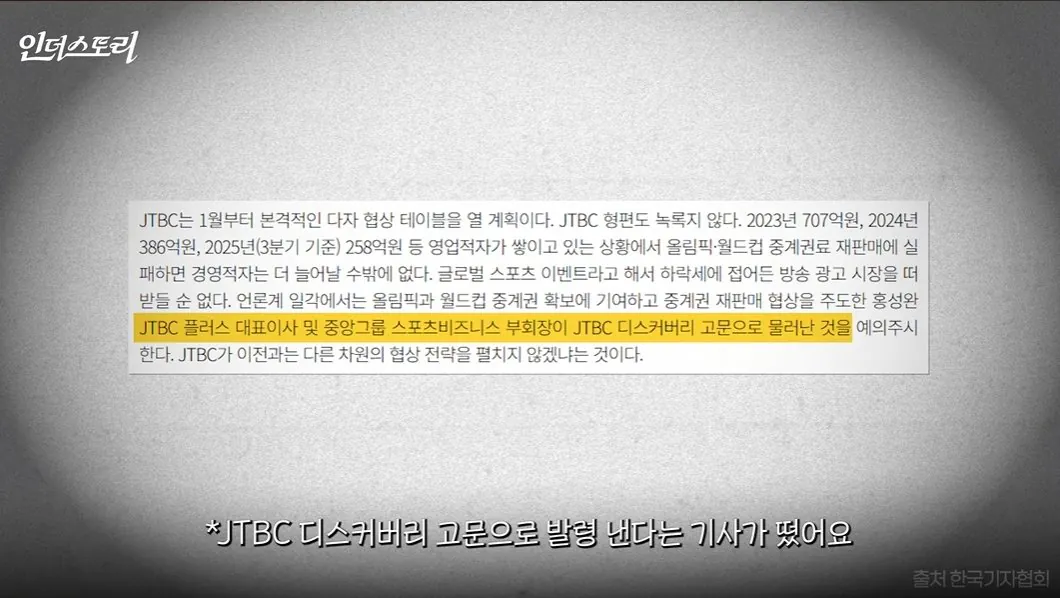 원래 부회장직이었는데 중계권 재판매 협상을 앞두고 JTBC 디스커버리 고문자리로 물러났다는 기사도 났음