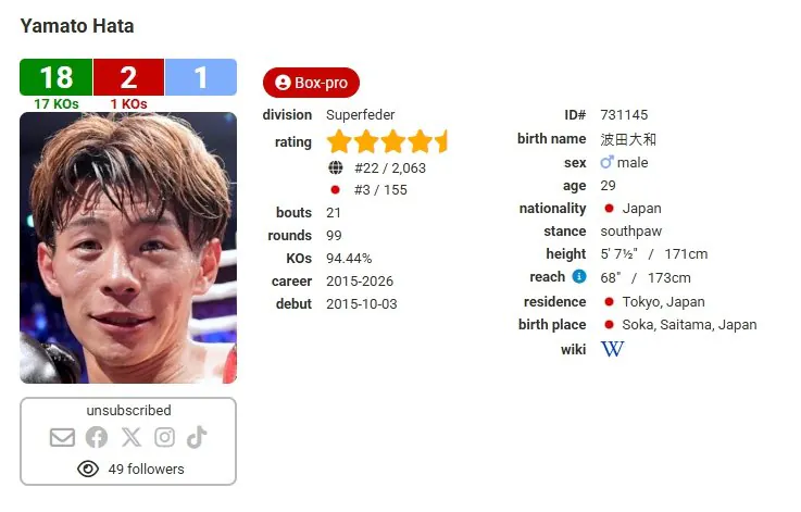 상대는 슈퍼페더급 일본랭킹 3위 세계랭킹 22위