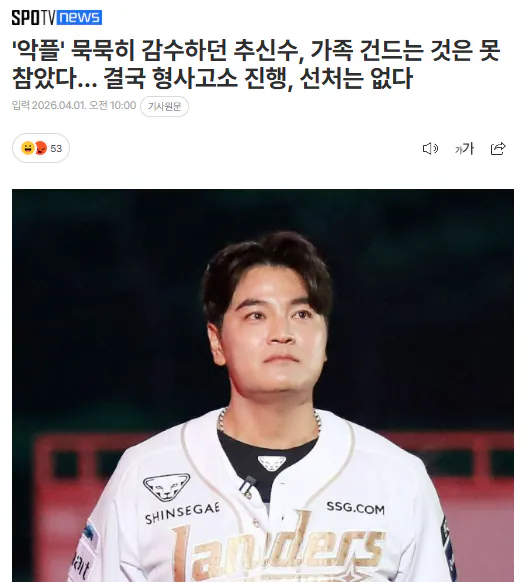 [스포티비뉴스=김태우 기자] 추신수 SSG 구단주 특별보좌역 및 육성총괄이 '악플러'들에 대한 형사고소를 진행한다. 지금까지 자신에 대한 무분별한 비난은 공인으로서 감수해 왔지만, 최근 가족들에 대한 원색적인 모욕이 도를 넘어서자 결국 법에 심판을 맡기기로 했다.