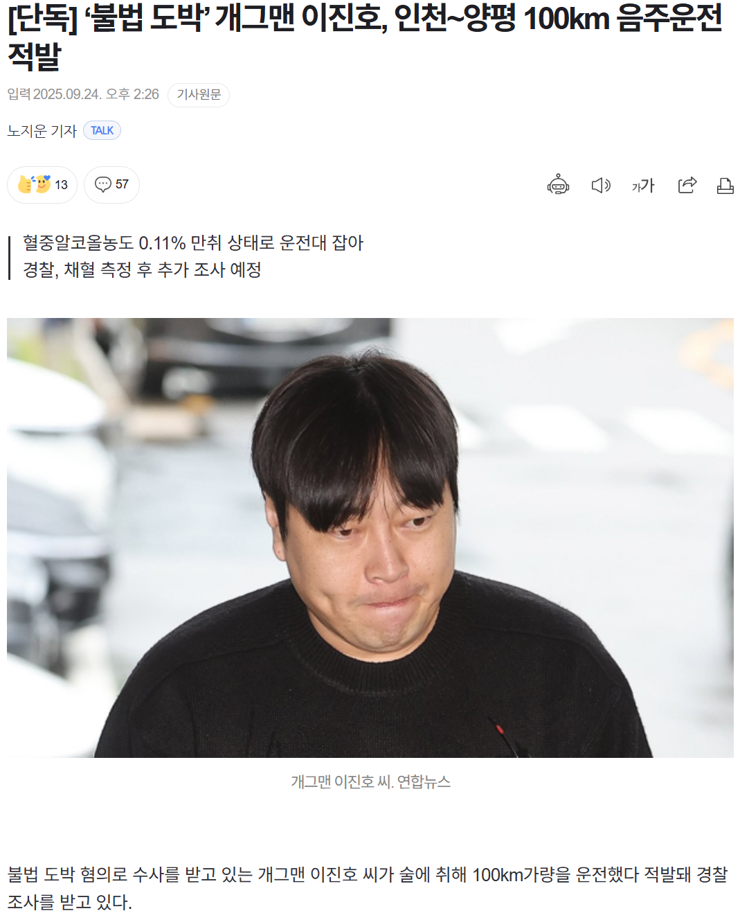 ‘불법 도박’ 개그맨 이진호, 인천~양평 100km 음주운전 적발 댓글 12 조회 67 2025-09-24 17:11 토네이도 Lv.8 게시글 보기 총 게시글: 2개 총 댓글: 11개 토네이도님의 다른 글 +5 25.12.30 여친이랑 섹스하게 집 비워 달라는 아들 +12 25.09.24 ‘불법 도박’ 개그맨 이진호, 인천~양평 100km 음주운전 적발