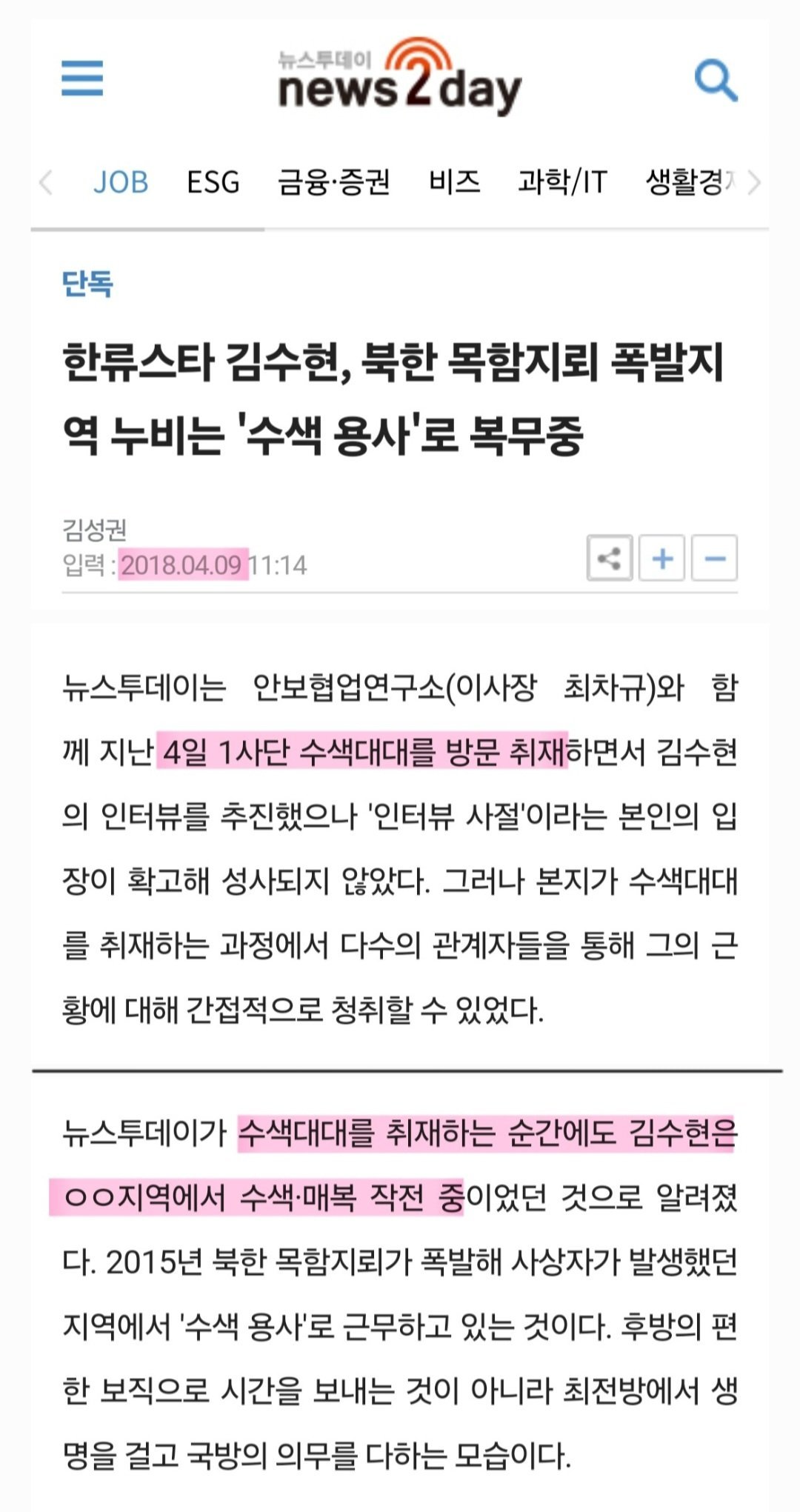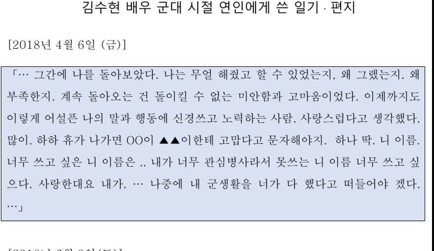 : 4월 2일 카톡에 목요일(4월 5일)에 보자고 써있는데, 김수현은 4월 4일에 매복 작전 중이라는 기사가 났고, 4월 6일에 부대에서 휴가 기다리면서 일기 썼음