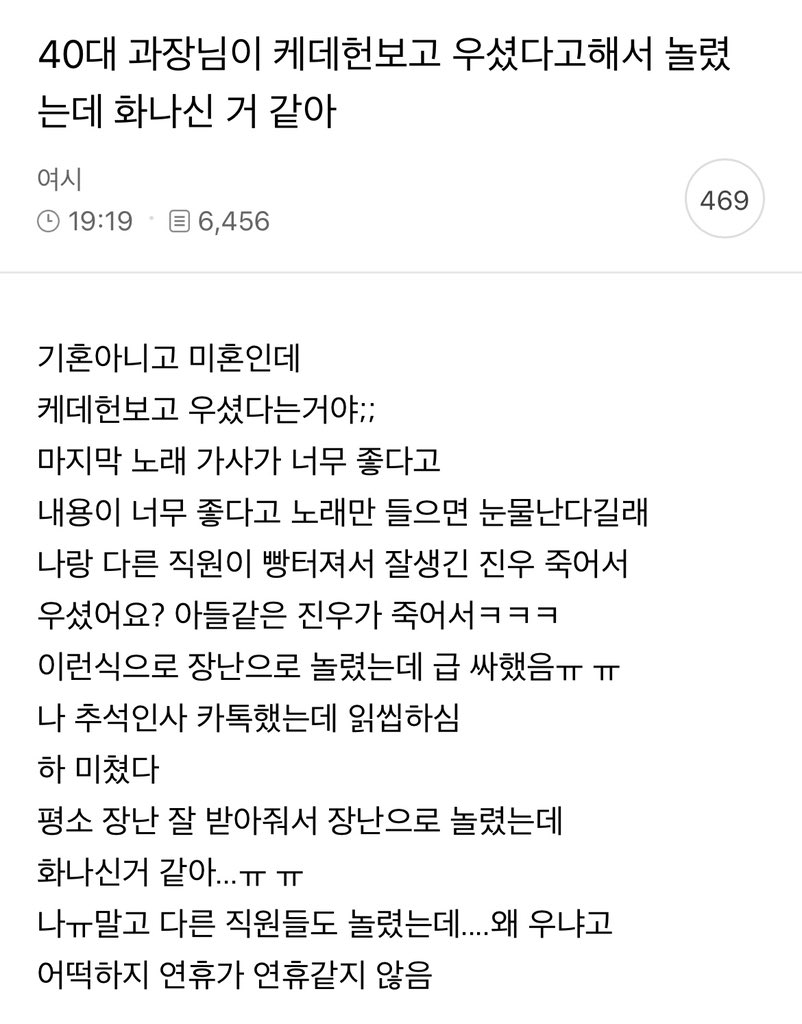 40대 과장님이 케데헌 보고 우셨다고해서 놀렸는데 댓글 0 조회 559 2025-10-06 16:43 관셈보살 Lv.3 게시글 보기 총 게시글: 513개 총 댓글: 0개 관셈보살님의 다른 글 25.10.14 38살 개그우먼의 청바지 핏 25.10.14 횟집 알바 하는 중앙대 공대생 25.10.14 캄보디아에서 50명 넘게 구출한 오창수 선교사 25.10.14 뷔페 3접시 밖에 못 먹는다는 아나운서 누나