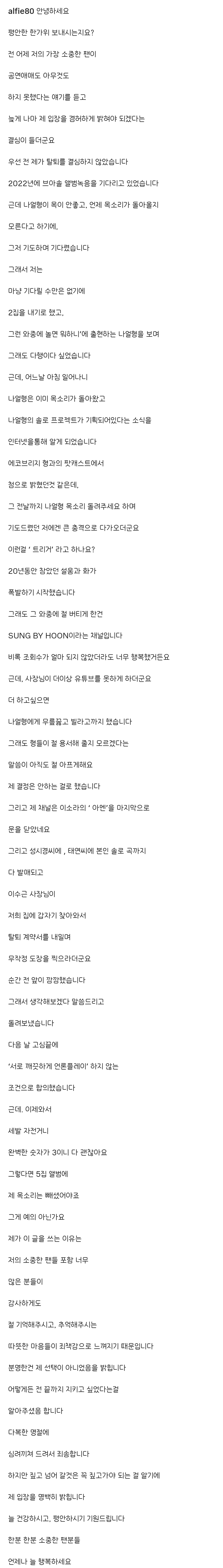 그런 와중에 놀면 워하니'에 출현하는 나얼형을 보며 그래도 다행이다 싶었습니다 근데, 어느날 아침 일어나니 나얼형은 이미 목소리가 돌아왔고 나얼형의 솔로 프로젝트가 기획되어있다는 소식을 인터넷을통해 알게 되었습니다 에코브리지 형과의 팟캐스트에서 청으로 밝혔던것 같은데 그 전날까지 나얼형 목소리 돌려주세요 하며 기도드렸던 저에겐 큰 충격으로 다가오더군요 이런걸'트리거' 라고 하나요? 20년동안 참았던 설움과 화가 폭발하기 시작했습니다 그래도 그 와중에 절 버티게 한건 SUNG BY HOON이라는 채널입니다 비록 조회수가 얼마 되지 않았더라도 너무 행복했거든요 근데, 사장닝이 더이상 유튜브를 못하게 하더군요 더 하고싶으면 나얼형에게 무릎끓고 빌라고까지 했습니다 그래도 형들이 절 용서해 줄지 모르겠다는 말씀이 아직도 절 아프게해요 제 결정은 안하는 걸로 했습니다 그리고 제 채널은 이소라의'아멘'을 마지막으로 문을 닫았네요 그리고 성시경씨에 , 태연씨에 본인 솔로 곡까지 다 발매되고 이수근 사장님이 저희 집에 갑자기 찾아와서 탈퇴 계약서를 내일며 무작정 도장을 찍으라더군요 순간 전 앞이 깡깡했습니디 그래서 생각해보겠다 말씀드리고 돌려보냈습니다 다음 날 고심끝에 '서로 깨끗하게 언론플레이' 하지 않는 조건으로 합의했습니다 근데. 이제와서 세발 자전거니 완벽한 숫자가 3이니 다 괜찮아요 그렇다면 5집 앨범어 제 목소리는 빼셨어야죠 그게 예의 아닌가요 제가 이 글을 쓰는 이유는 저의 소중한 팬들 포항 너무 많은분들이 감사하게도 절 기억해주시고, 추억해주시는 따뜻한 마음들이 죄책감으로 느껴지기 때문입니다 분명한건 제 선택이 아니었음을 밝힙니다 어떻게든 전 끝까지 지키고 싶었다는걸