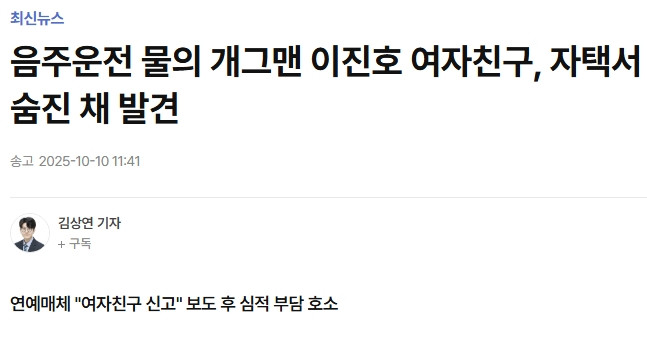 개그맨 이진호 여자친구 자택서 숨진 채 발견 댓글 0 조회 579 2025-10-10 13:52 관셈보살 Lv.3 게시글 보기 총 게시글: 492개 총 댓글: 0개 음주운전 물의 개그맨 이진호 여자친구, 자택서 숨진 채 발견 | 연합뉴스 관셈보살님의 다른 글 25.10.11 <삼국지> 헌제의 닭국 먹방 25.10.11 하후돈 개인기 보여주는 ITZY 유나 25.10.11 주우재가 마라탕 붐일때 마라탕 단 한 번도 안 먹은 이유 25.10.11 QWER 멤버들 바지 길이