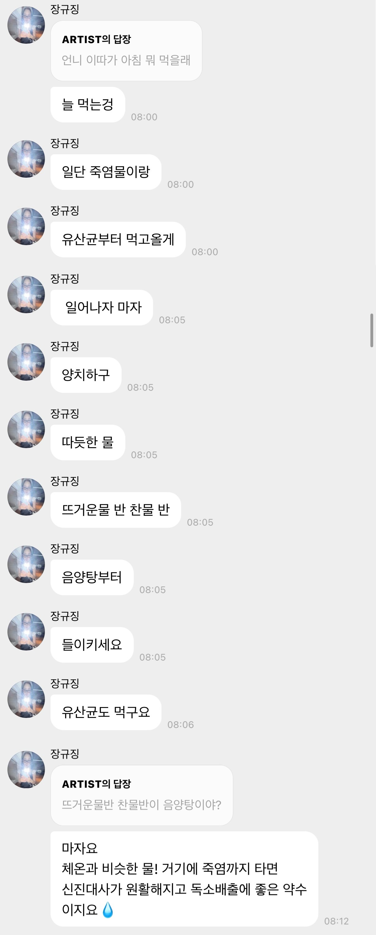아침마다 음양탕(뜨거운물+차가운물=미지근한물)&죽염물 마시는 엔믹스 규진... 그리고 공복에 아아 때려넣는 해원...