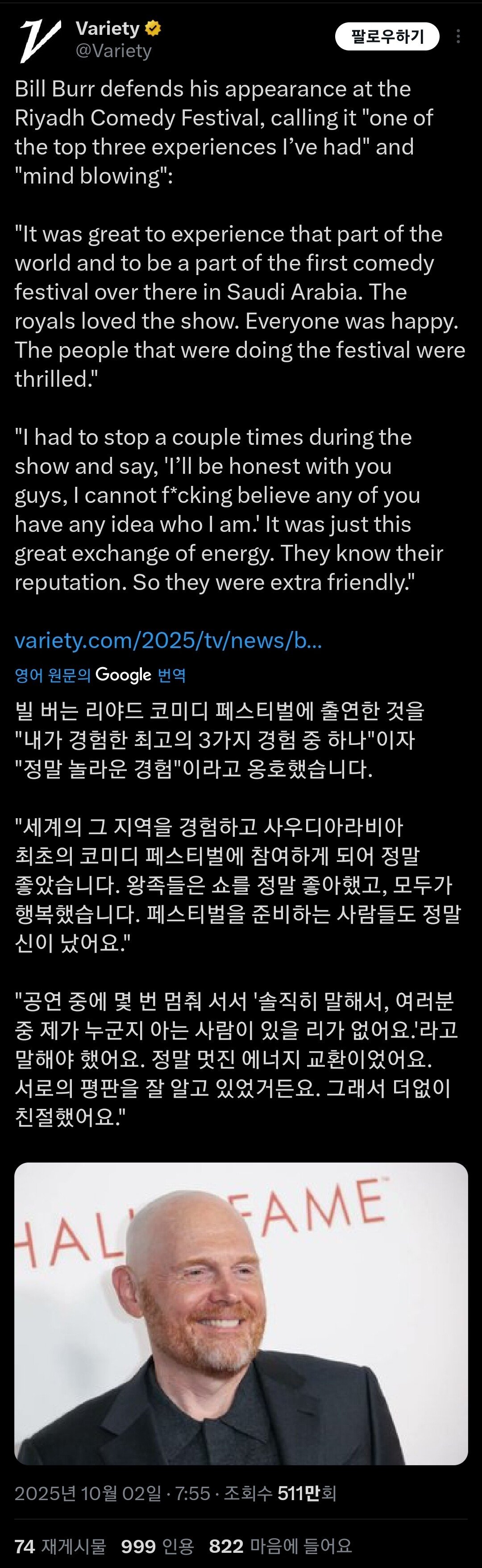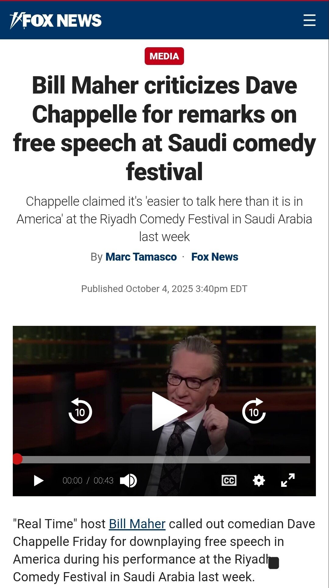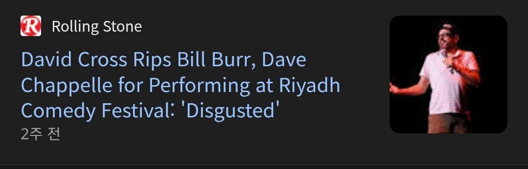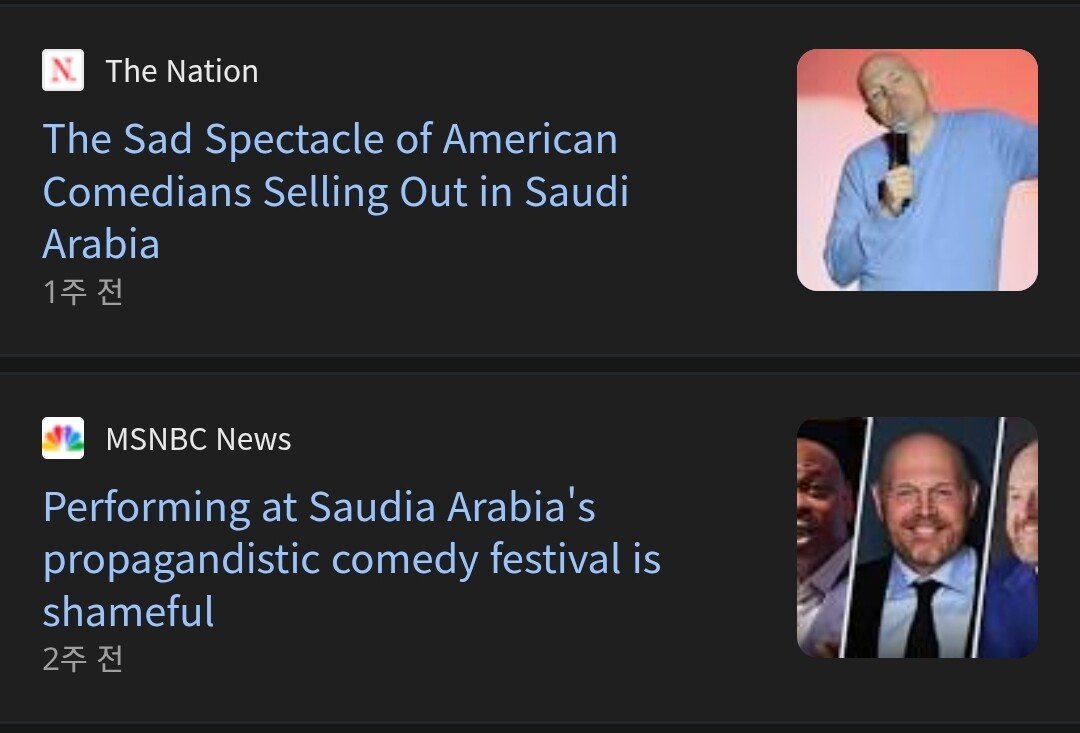 데이비드 샤펠이라고 유명 스탠드업 코미디언도 이번 사우디가서 " 미국보다 사우디가 더 자유롭다 " 같은 엉덩이 핥아주는 소리하고오자 미국 토크쇼 진행자 빌 마허한테 비판받음