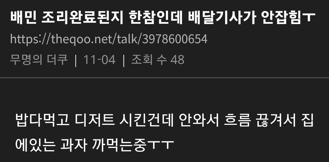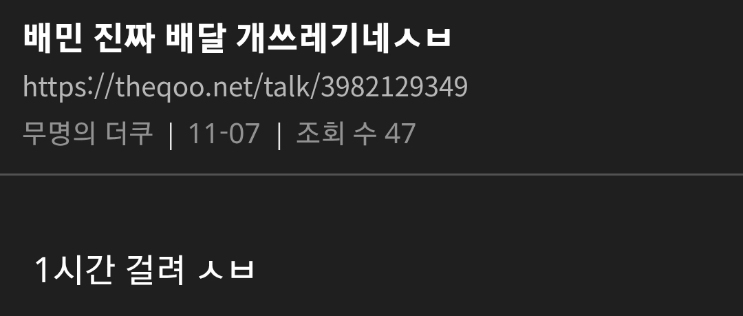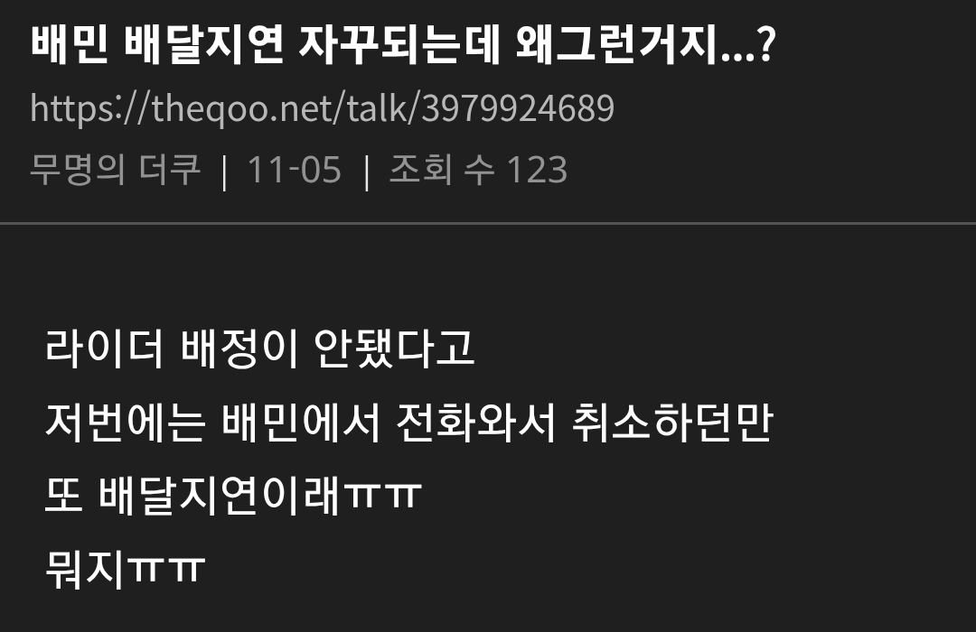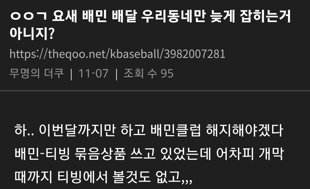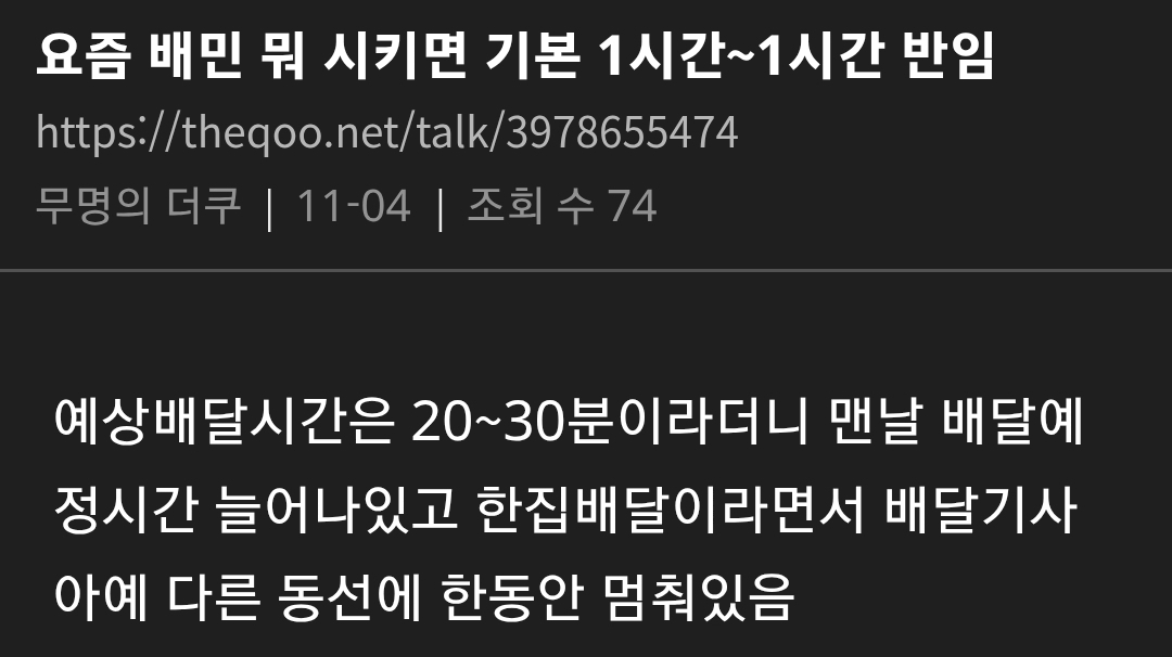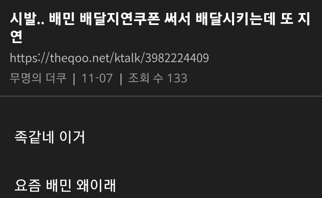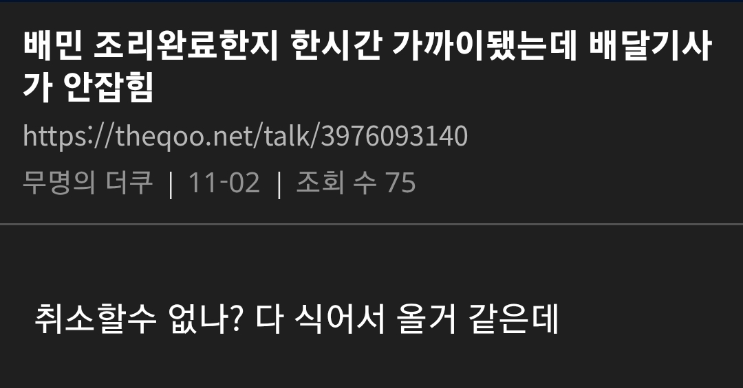 요즘 엄청 말 나오고 있는 배달의민족 상황 댓글 2 조회 586 2025-11-08 17:39 개장수11 Lv.7 게시글 보기 총 게시글: 925개 총 댓글: 0개 라이더 잘 안 잡히고 배달 ㄹㅇ 늦음 조리 완료됐는데 오랫동안 배달 시작도 안되는 경우 진짜 많음 개장수11님의 다른 글 25.11.28 아이온2 직원이 쌀먹? 들킴 ㅋㅋㅋㅋㅋㅋㅋ 25.11.28 지자체에서 구상한 팬미팅 갑자기 노쇼한 사람의 최후 25.11.28 격투기 챔피언 VS 신문지 든 검도 국가대표 25.11.28 폐지 줍는 할머니께 신용카드 드리면 생기는 일