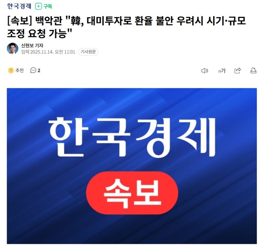 백악관 "韓, 대미투자 환율 불안시 시기·규모 조정 가능"