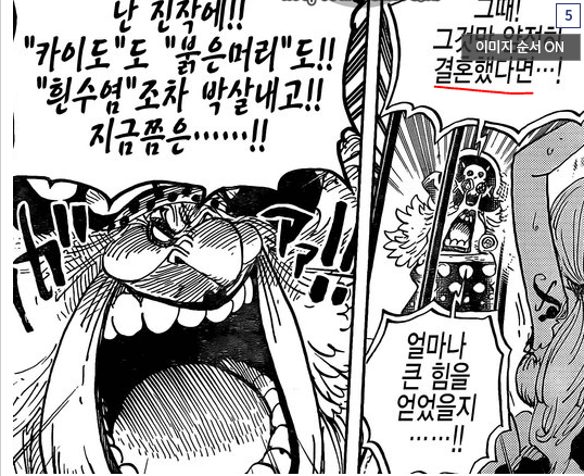 "그때 그것만 얌전히 결혼했다면 얼마나 큰 힘을 얻었을지....난 진작에 '카이도'도 '붉은머리'도'흰수염'조차 박살내고 지금 쯤은..."