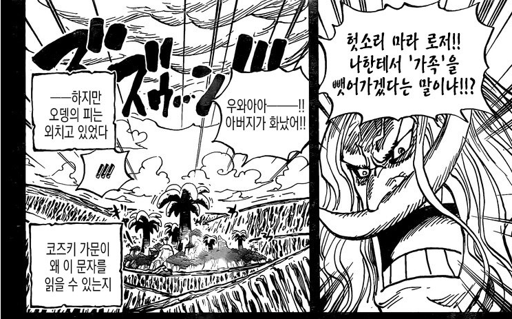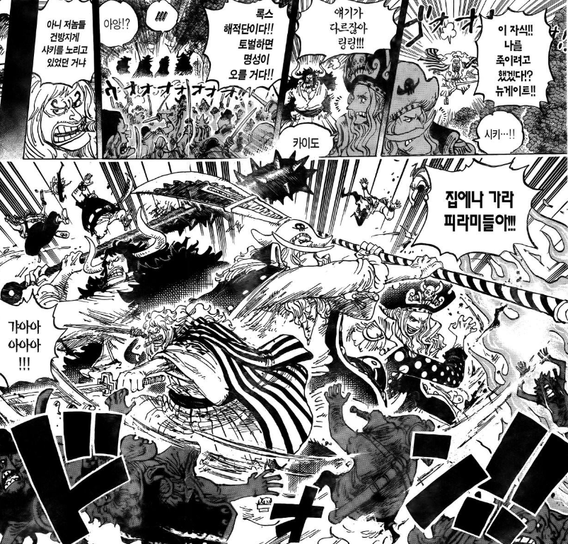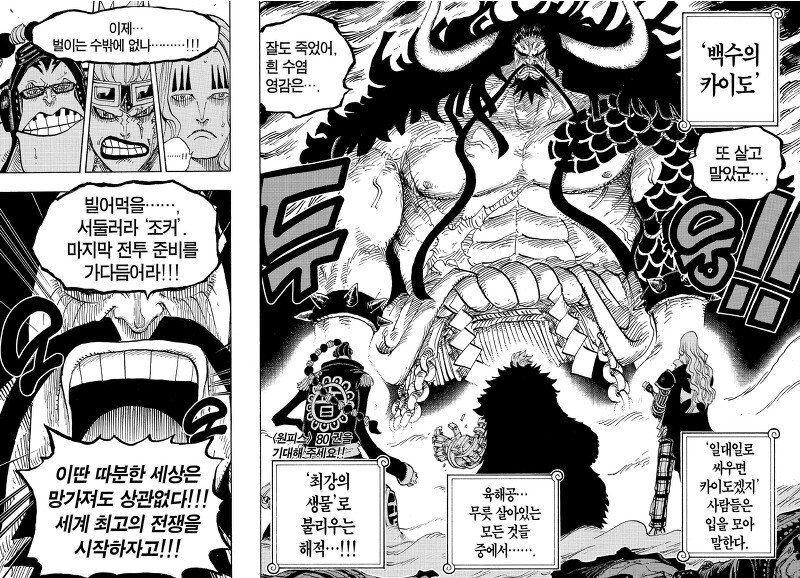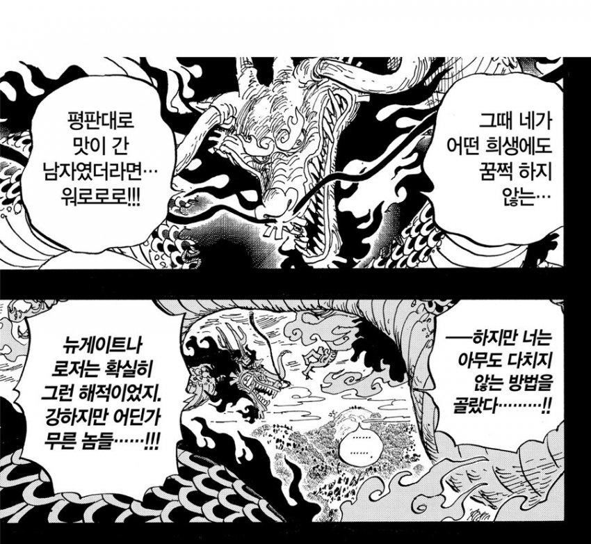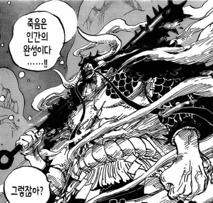 카이도가 '세계 최강의 생물'로 압도적인 연출을 보여주었을 지라도 생전 흰수염의 위상에는 미치지 못했다고 생각한다.