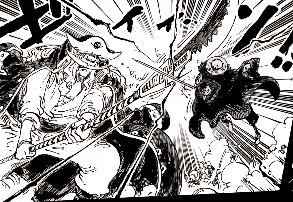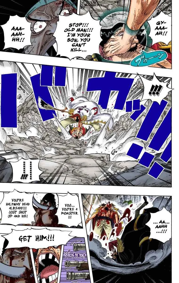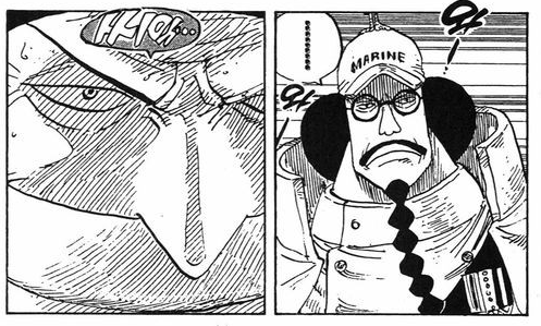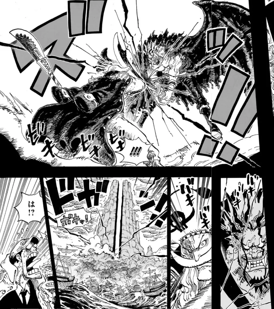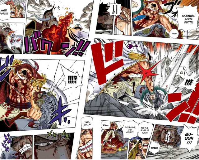 아카이누는 명구로 흰수염의 머리 절반을 날려버리는 충격적인 공격을 성공시킨다.