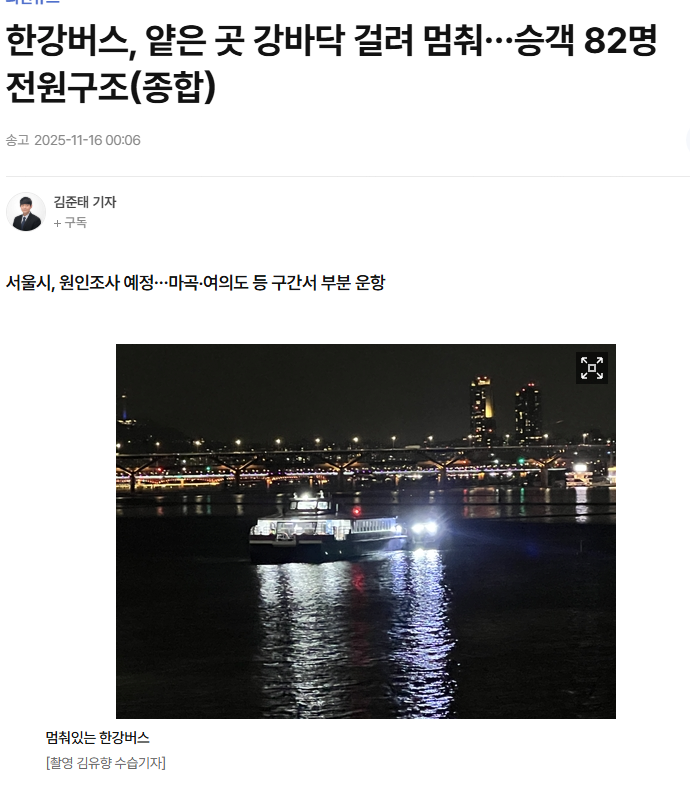 오세훈의 야심작 한강 버스 또 사고 터짐
