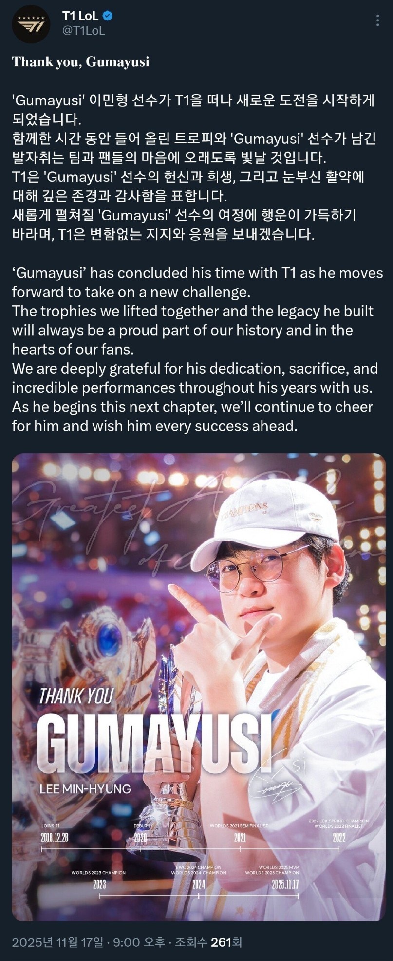 (오피셜) T1 구마유시 이적 ㄷㄷ