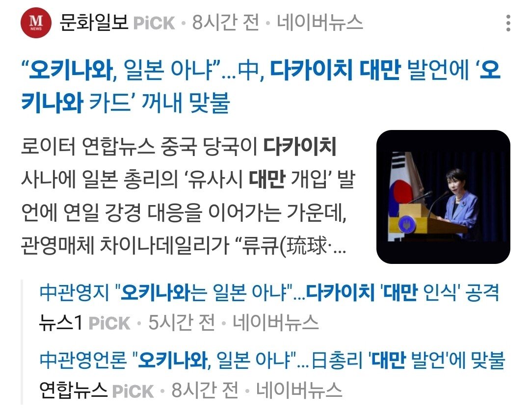 최근 일본 총리가 '대만'을 언급하자 맞불 작전으로 '오키나와' 카드를 꺼낸 중국 당국
