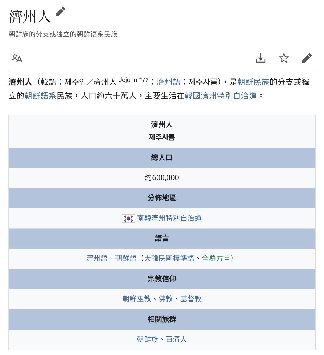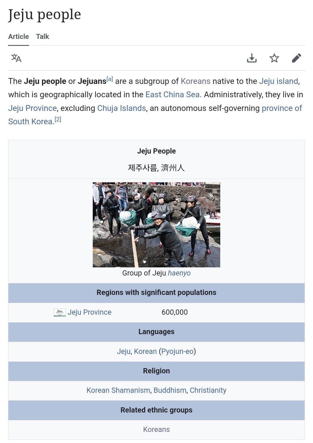 그 표본이 바로 영어판 위키피디아에 개설된 '제주인'(Jeju people)이라는 문서다.