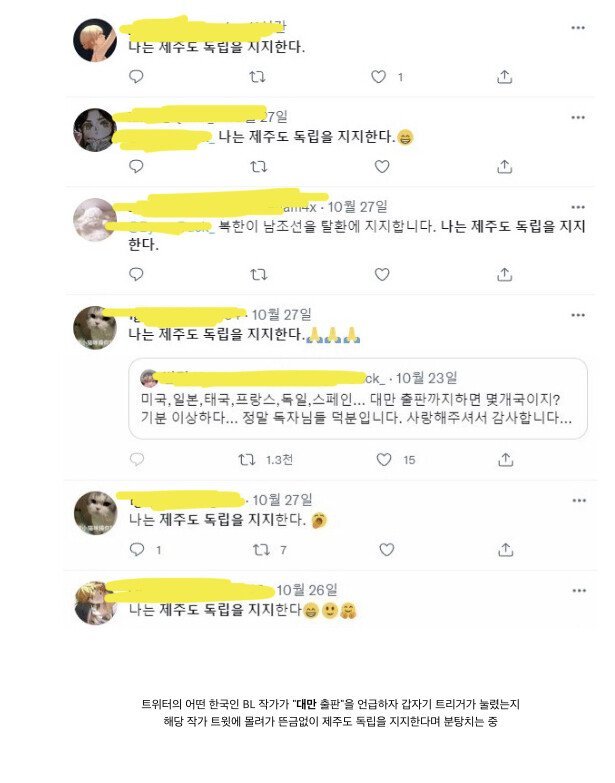 중국 유저들이 작가 트윗으로 몰려가 갑자기 '제주도 독립을 지지한다'고 도배를 해댔고, 이 촌극이 국내 언론에 보도돼 한국인들의 비웃음을 샀다