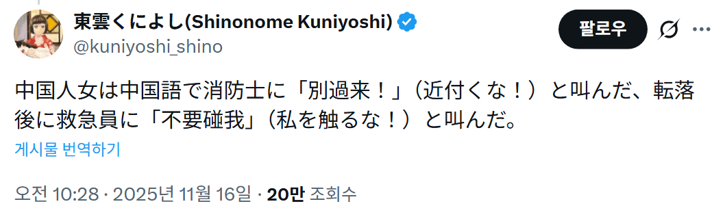 "저 중국인 여성은 소방관한테 중국어로 別過来!(가까이 오지 마!) 라고 소리쳤고, 추락한 후 구급대원한테 "不要碰我(나 만지지 마!)라고 외침"