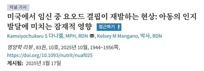 올해 나온 논문에 미국에서 요오드 결핍이 재발, 증가하고 있다고 보고 됨. 미국은 요오드 소금을 통해서 요오드결핍이 안정권으로 왔다고 하는데 요오드 결핍이 증가하니 영양 정책이 필요하다고 함. 그만큼 미국을 비롯해서 해외는 요오드 섭취를 매우 중요하게 보는데 당장 한국은 요오드 과섭취하는 국가 중 하나임. 왜냐하면