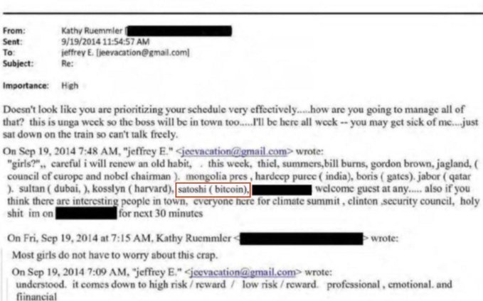 제프리 엡스타인이 최근 유출한 이메일인데, 2014년 기후 정상회의에 참석했던 주요 인사들을 나열한 후 사토시(비트코인)가 누구인지 알고 있었다는 늬앙스 내용이 담겨 있습니다.