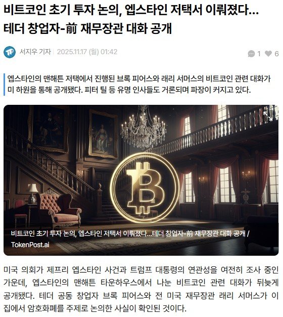 - 엡스타인의 맨해튼 저택에서 테더(Tether) 공동 창업자 브록 피어스(Brock Pierce), 전 재무장관 래리 서머스(Larry Summers), 페이팔 공동 창업자 피터 틸(Peter Thiel) 간 비트코인 초기 투자 논의가 이뤄진 대화 기록도 공개됨.