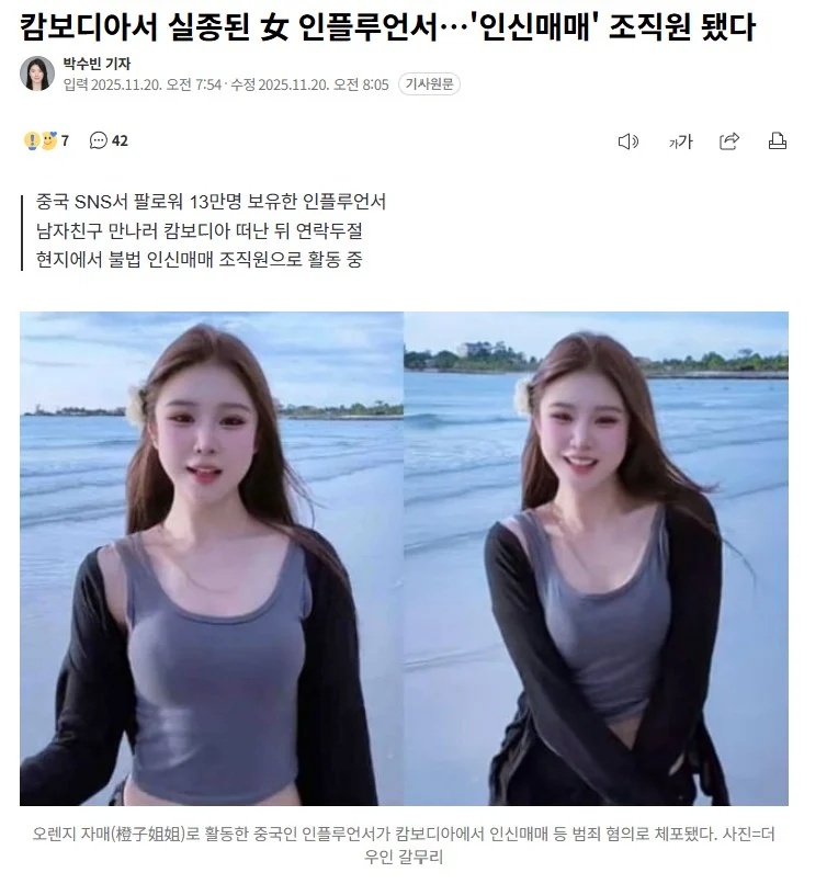 캄보디아에서 실종된 중국 인플루언서 근황
