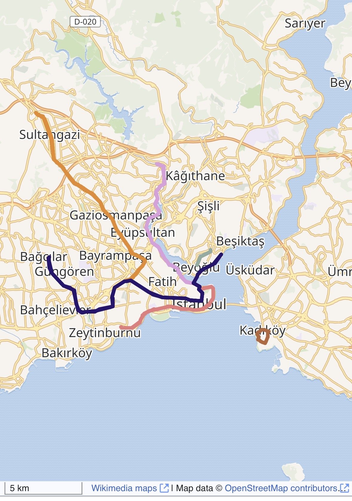 베식타쉬, 갈라타, 파티흐 역사지구, 주거단지 제딘브누를 가로지르는 19.3km짜리 노선으로.