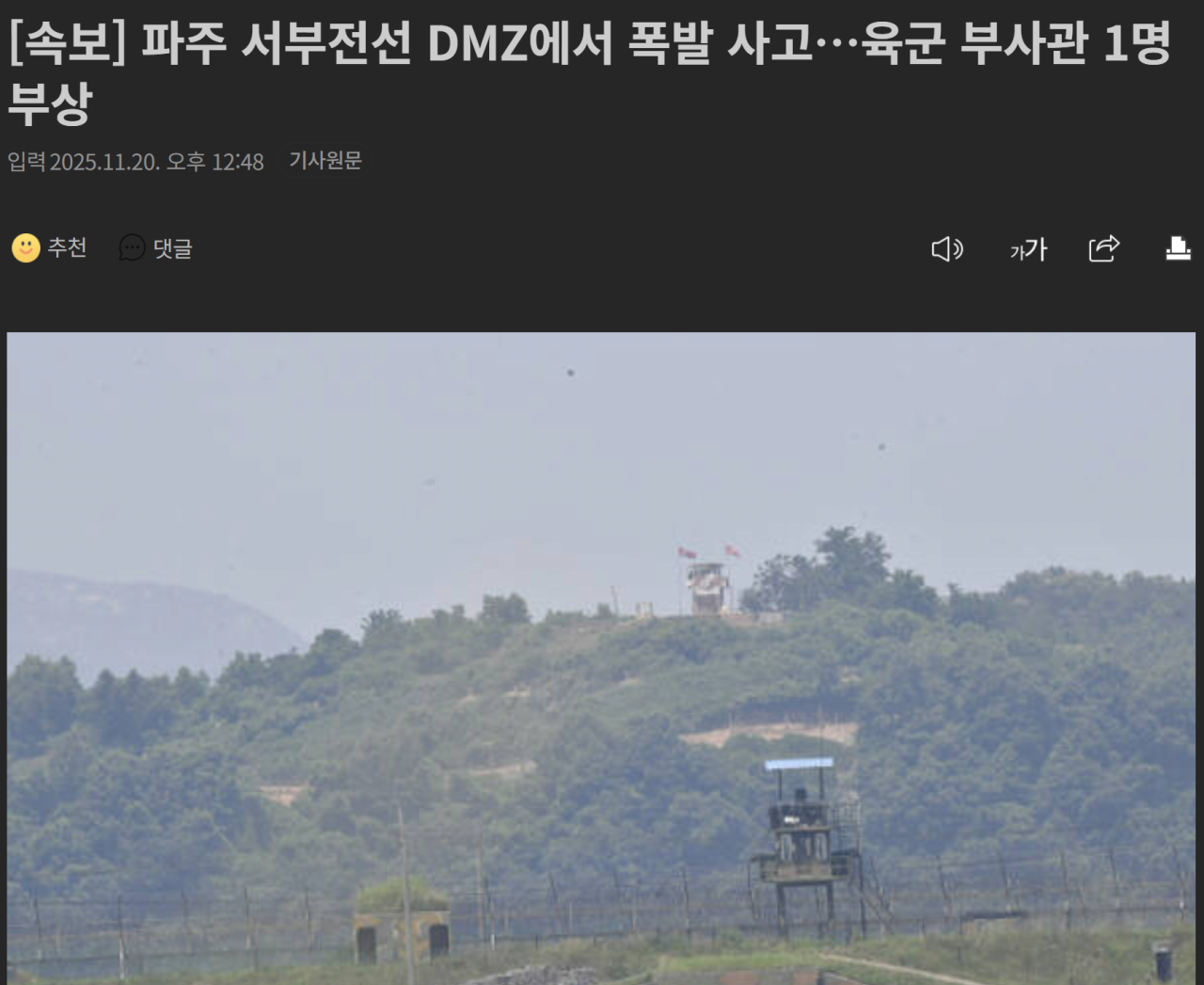 비무장지대(DMZ)에서 원인 미상의 폭발 사고가 일어나 육군 모 부대 소속 A(24) 하사가 병원으로 긴급 이송